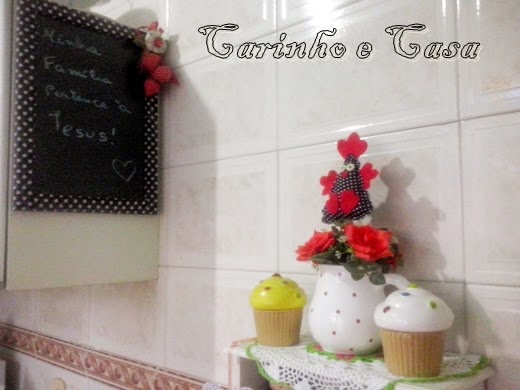 Amei ver os detalhes da sua Cozinha! Cada coisa mais "fofa" que a outra. Amei : do pano quadriculado vermelho e branco com fuxico na beira, à Chaleira pintada! Parabéns!